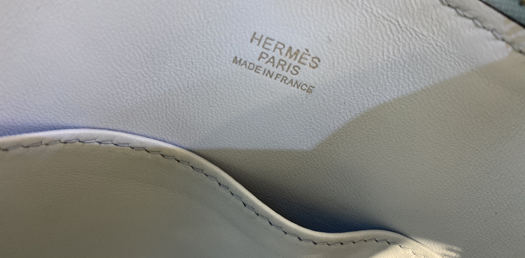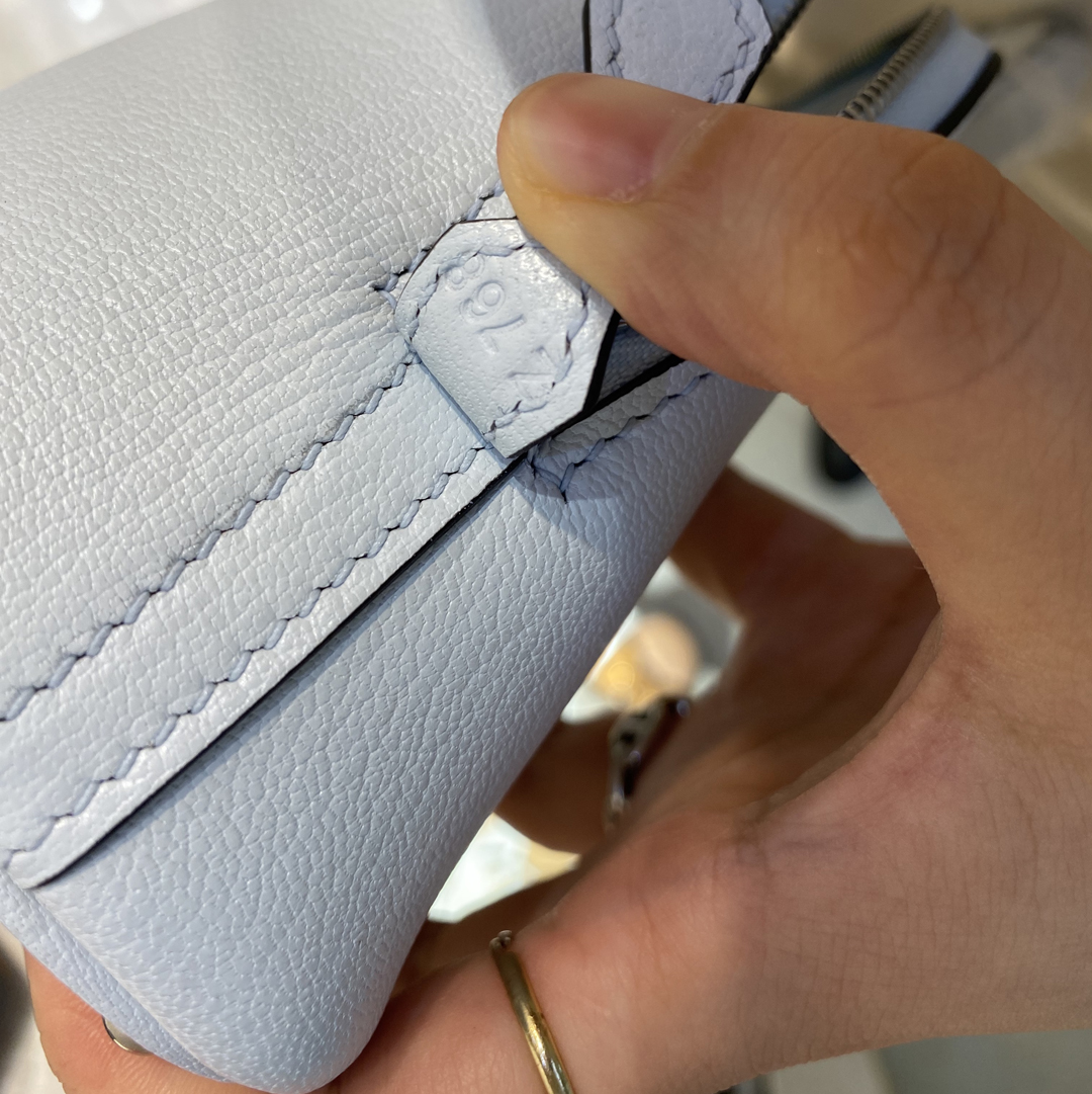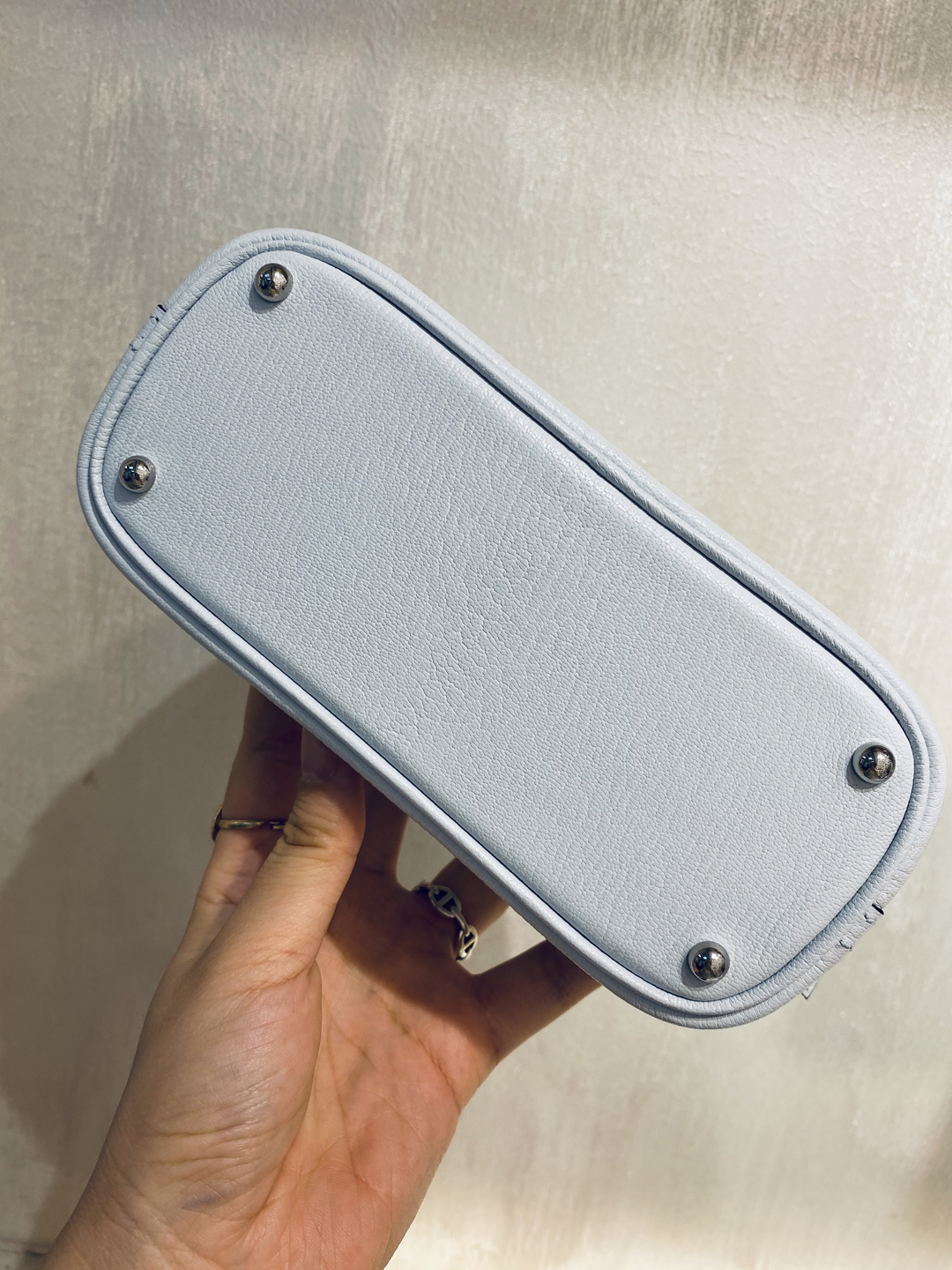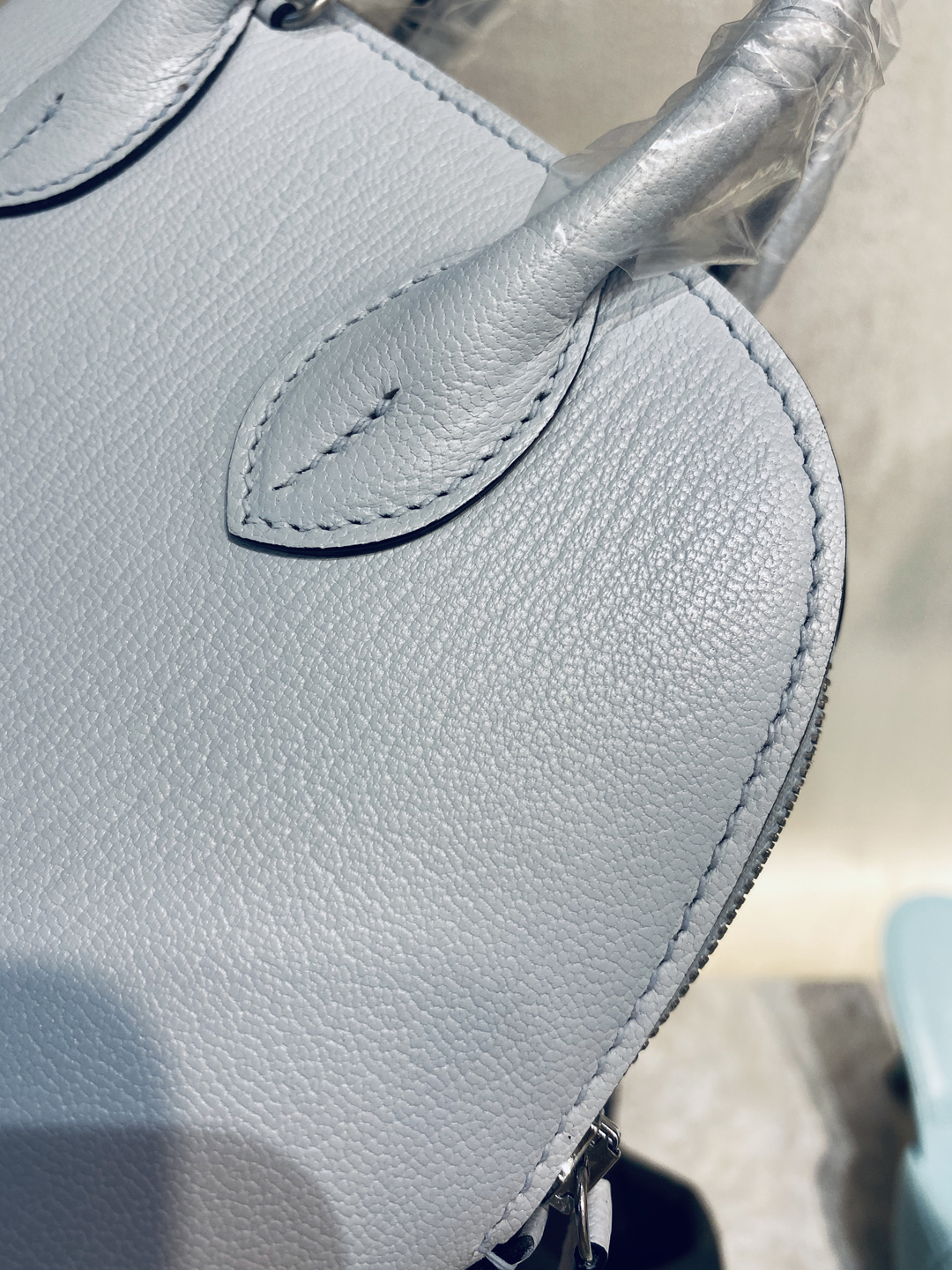 The Bleu Brume Hermes Mini Bolide is a new color from spring 2020 that shows like an icy blue, almost-white, mist in the Chevre Mysore leather of this Hermes Mini Bolide 1923! It’s paired with palladium feet and a touch of hardware in the top zipper that opens to tonal leather and one slide pocket inside.
